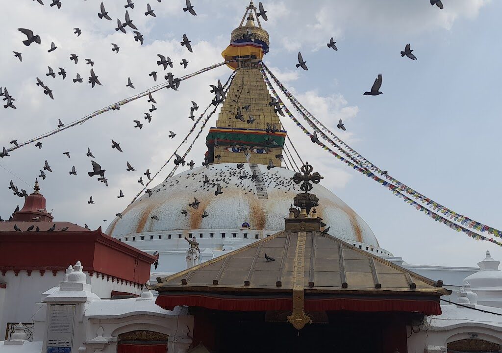 Notre dernière destination fut le stupa de Boudhanath, où nous sommes arrivés en milieu d’après-midi. Après un repas dans un restaurant offrant une vue imprenable sur le stupa de 36 mètres, ornée des yeux de Bouddha et d’une flèche dorée à 13 niveaux, nous avons visité le monastère Guru Lhakhang. À l’intérieur, nous avons été éblouis par les statues de Guru Rinpoche, Shakyamuni Bouddha, Chenrezig, Tara Blanche et Manjushri, nichées parmi des fresques éclatantes. À l’extérieur, les fidèles effectuaient une kora vespérale, allumant des lampes à beurre et psalmodiant « Om Mani Padme Hum » pour purifier leur karma. Les rayons dorés du soleil couchant illuminaient le stupa, laissant  Chantal et Elliot bouche bée. À 17h30, je les ai raccompagnées à leur hôtel, alors qu’elles se préparaient à partir pour Nagarkot le lendemain. Elles m’ont donné rendez-vous le 23 septembre pour rencontrer un astrologue népalais, leur passion pour l’astrologie – Chantal étant numérologue – les poussant à explorer l’astrologie orientale basée sur le calendrier lunaire.