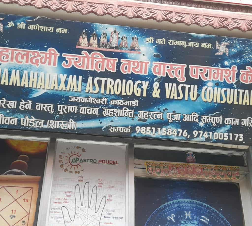 Le 23 septembre 2025, j’ai échangé avec Chantal via WhatsApp pour organiser une rencontre avec un astrologue sur la rue Jaya Bageshwori, près du temple de Pashupatinath. Leur vol depuis Nagarkot ayant quatre heures et demie de retard, j’ai dû reporter le rendez-vous de 14h30 à 16h00 avec un astrologue réputé, érudit Shastri fort de 20 ans d’expérience. La rue grouillait d’astrologues, numérologues et chiromanciens promettant de dévoiler l’avenir et d’offrir des remèdes. En entrant dans le bureau de l’astrologue, nous avons ôté nos chaussures et pénétré dans une salle où il nous attendait, prêt à faire parler les étoiles.